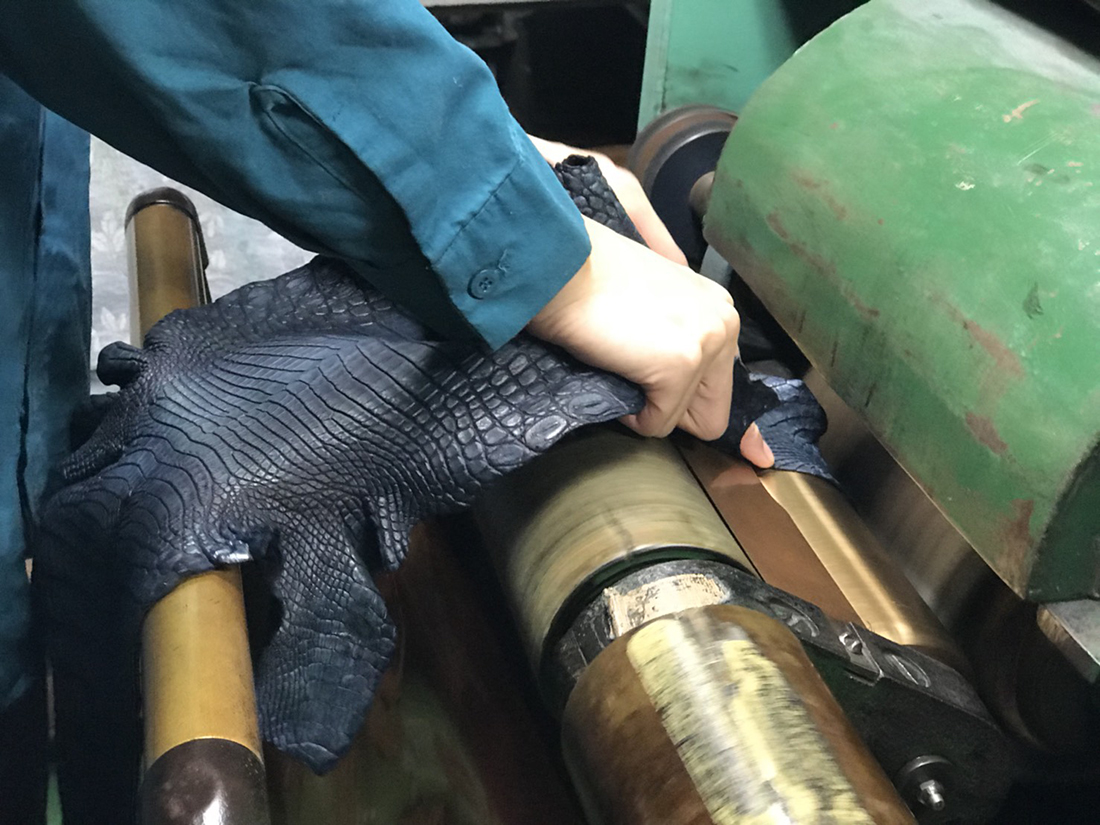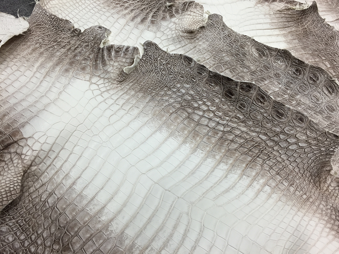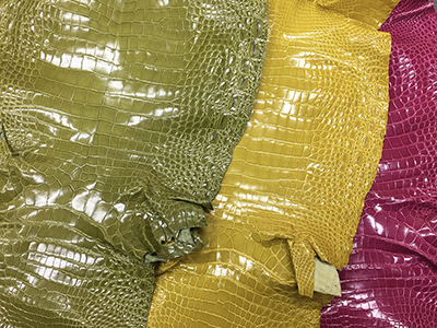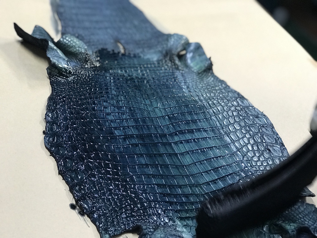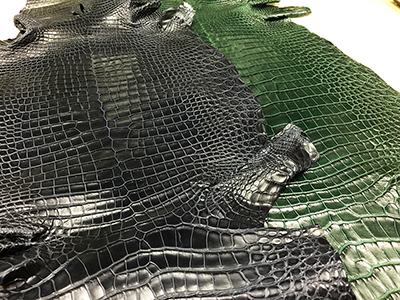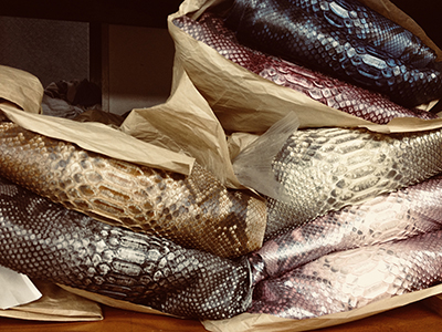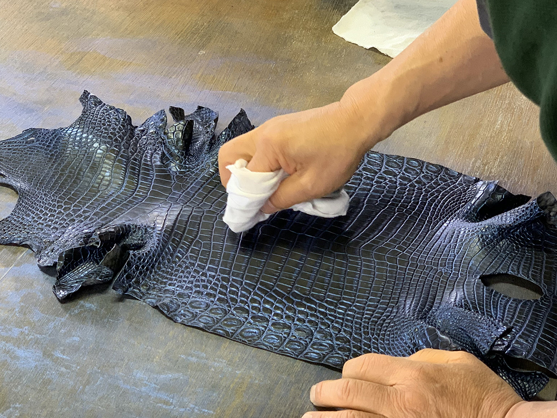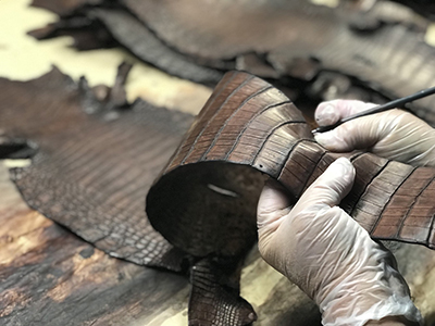 設立当初から現在に至るまで変わることなく、クロコダイル・オーストリッチ・パイソン・リザード・エレファント・シャーク等の高級皮革のエキスパートとして現地ファームより直接原皮・クラスト(染色前の下地)を輸入し、協力タンナーのもとで染色まで一貫して行っています。